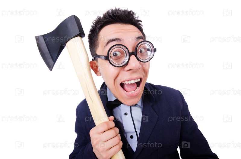 Смешной бизнесмен с топором на белом фоне