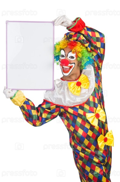 Клоун с пустым баннером на белом фоне