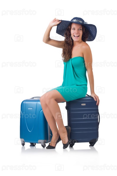 Девушка с чемоданами, изолированная на белом фоне