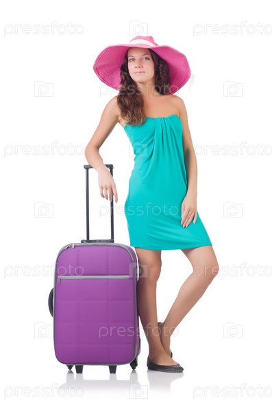 Девушка с чемоданами, изолированная на белом фоне