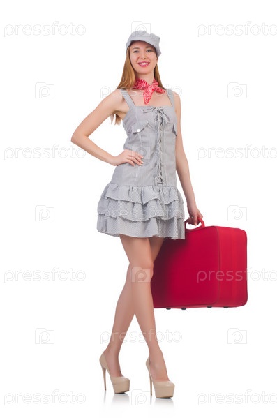 Молодая женщина с чемоданом на белом фоне