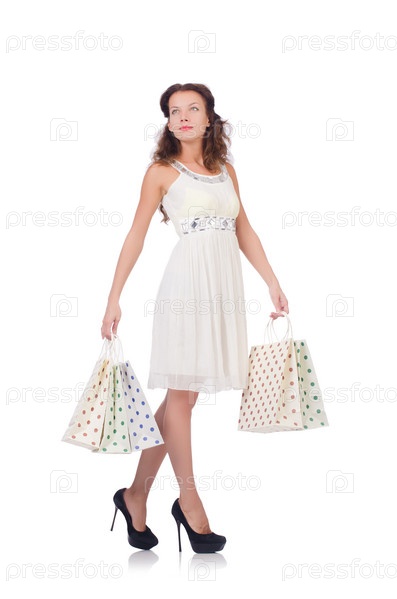 Девушка после шопинга на белом фоне