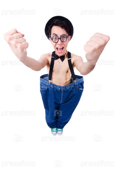 Забавный человек с брюками, изолированный на белом фоне