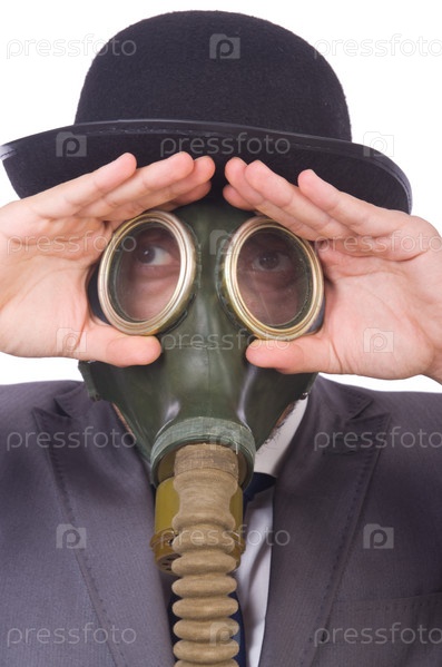 Бизнесмен в противогазе, изолированный на белом фоне