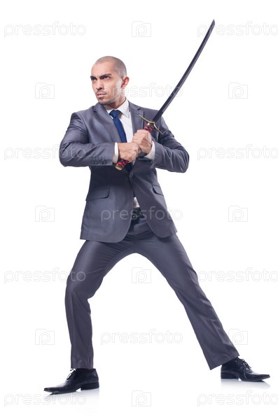 Бизнесмен с мечом, изолированный на белом фоне