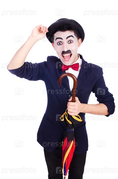 Забавный человек с зонтиком на белом фоне
