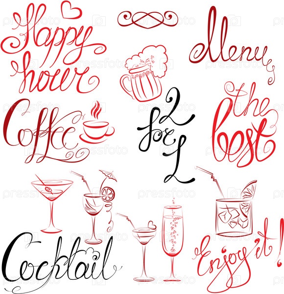 Набор рукописных текстов: счастливый час, меню, кофе, коктейли и т.д. Каллиграфические элементы для кафе или ресторана