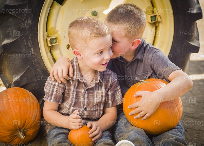Два мальчика с тыквами сидят у тракторного колеса