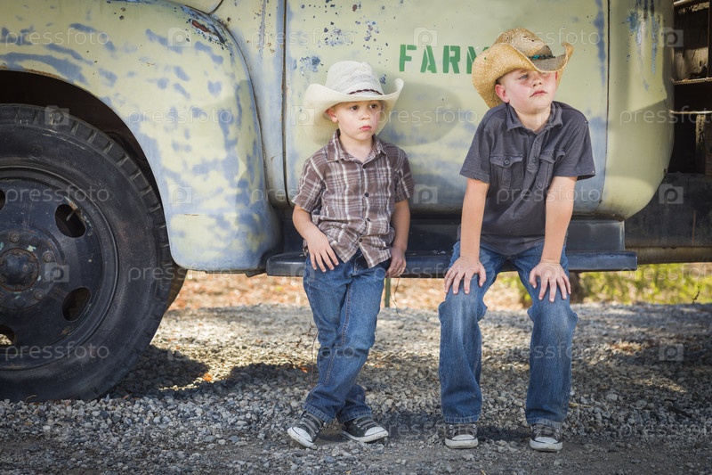 Два мальчика в ковбойских шляпах у старого грузовика