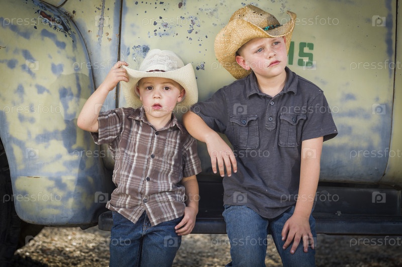 Два мальчика в ковбойских шляпах у старого грузовика