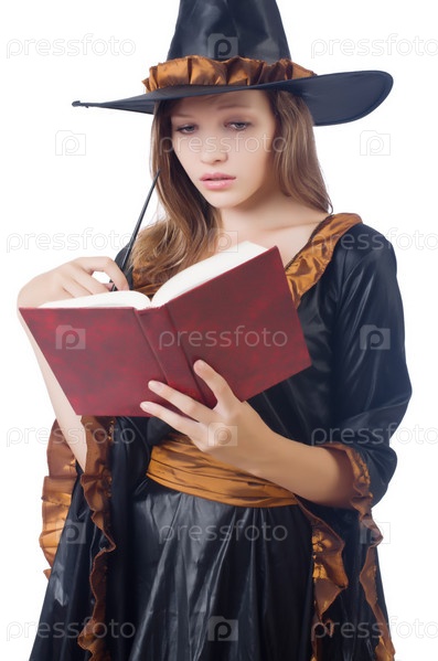 Ведьма с палочкой и книгой, изолированная на белом фоне