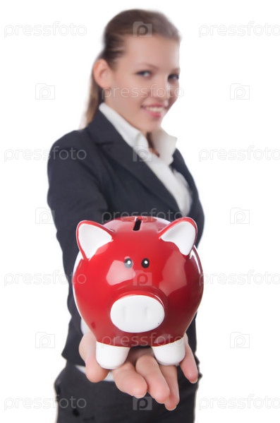 Деловая женщина с копилкой на белом фоне