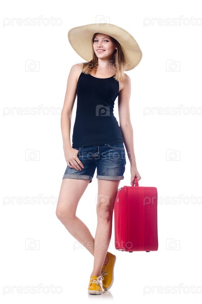 Девушка путешествует, изолировано на белом