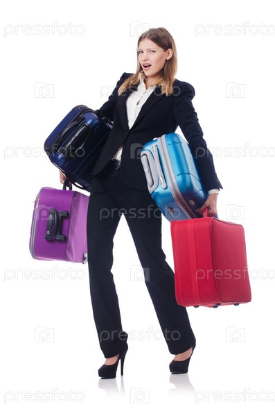 Деловая женщина с чемоданами, изолированная на белом