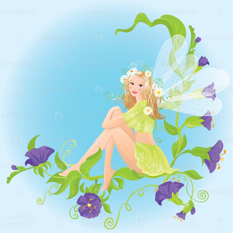 Маленькая фея сидит на красивом полевом цветке