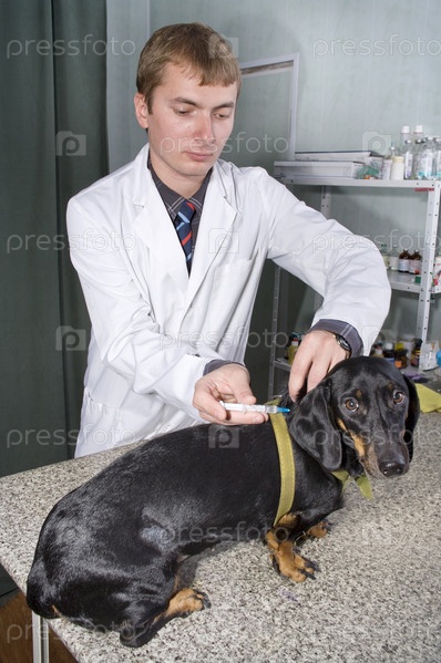 Ветеринар делает инъекцию таксе