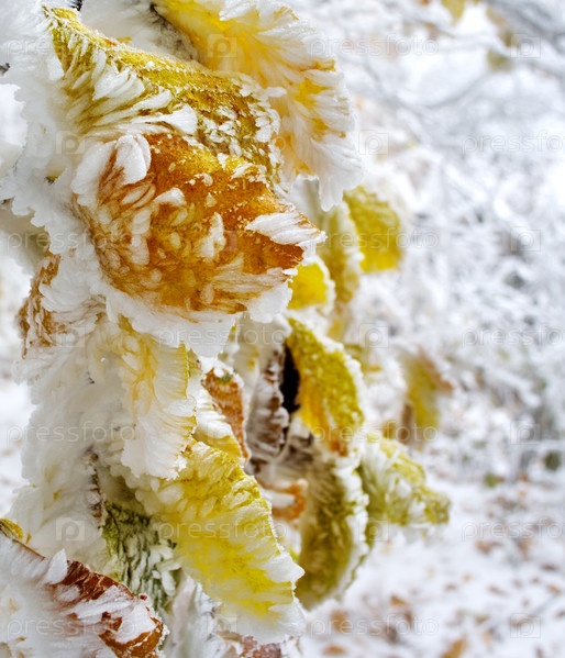 Красочные листья дерева, покрытые снегом