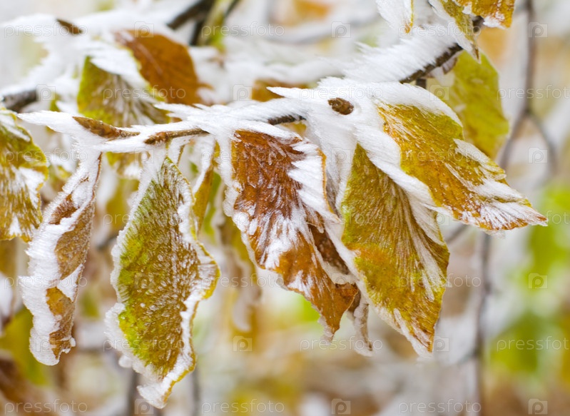 Листья дерева, покрытые снегом. Мягкий фокус