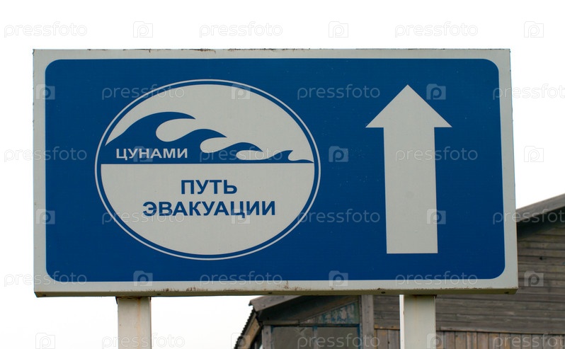 Знак маршрута эвакуации при цунами. Остров Парамушир, Россия
