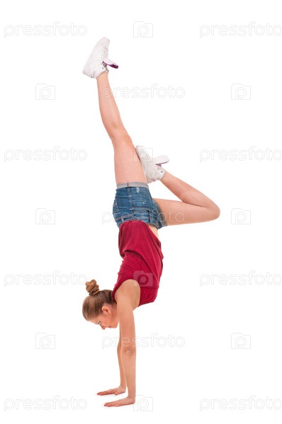 Молодая профессиональная гимнастка стоит на руках на белом фоне