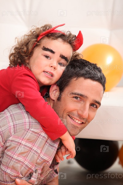 Отец держит на спине сына в костюме дьявола