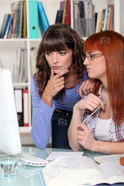 Две девушки смотрят на экран компьютера