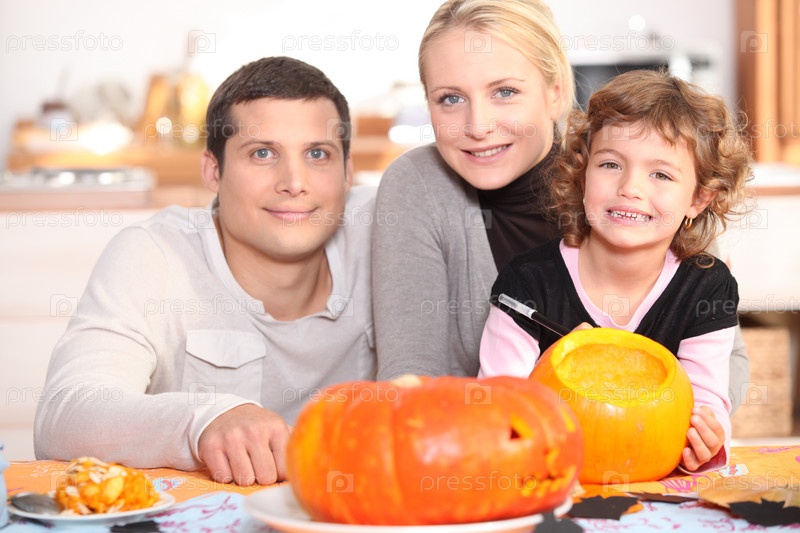 Семья вырезает тыквы вместе