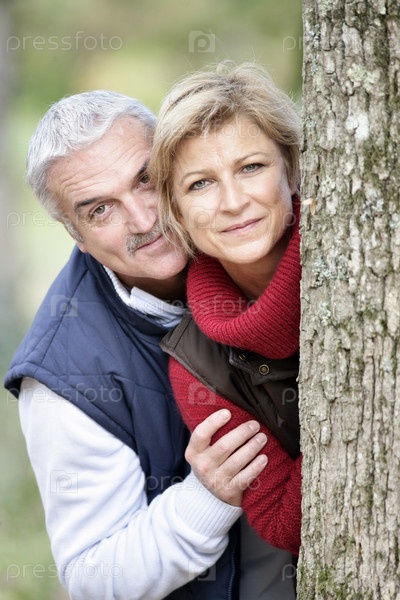 Пожилая пара выглядывает из-за дерева