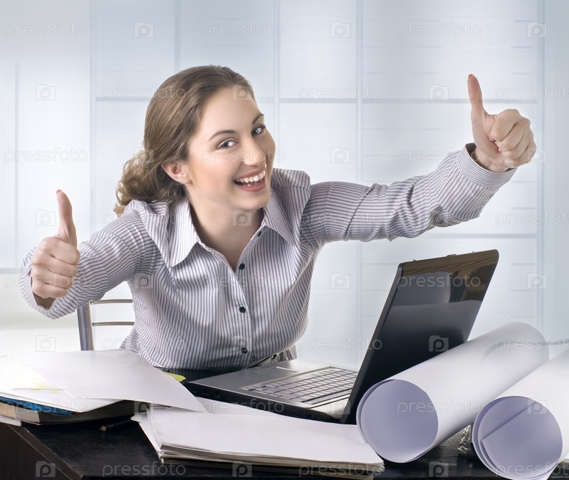 Деловая женщина в офисе с ноутбуком показывает большие пальцы