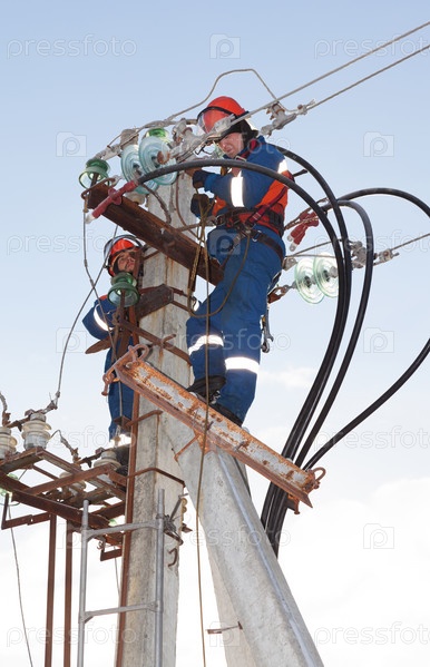 Электрик в синем комбинезоне работает на высоте