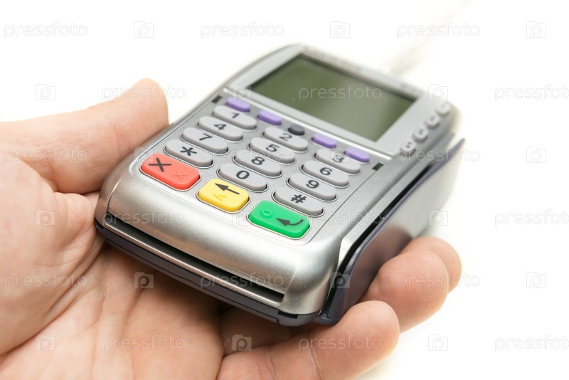 Современный банковский терминал в мужской руке