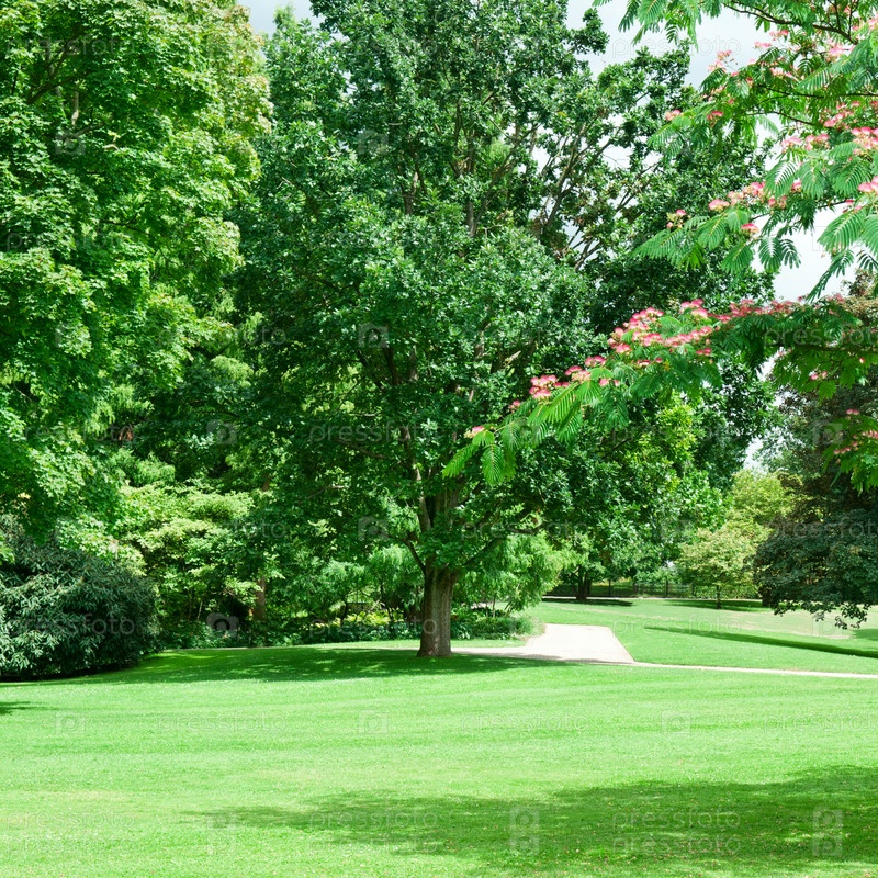 Летний парк с красивым зеленым газоном