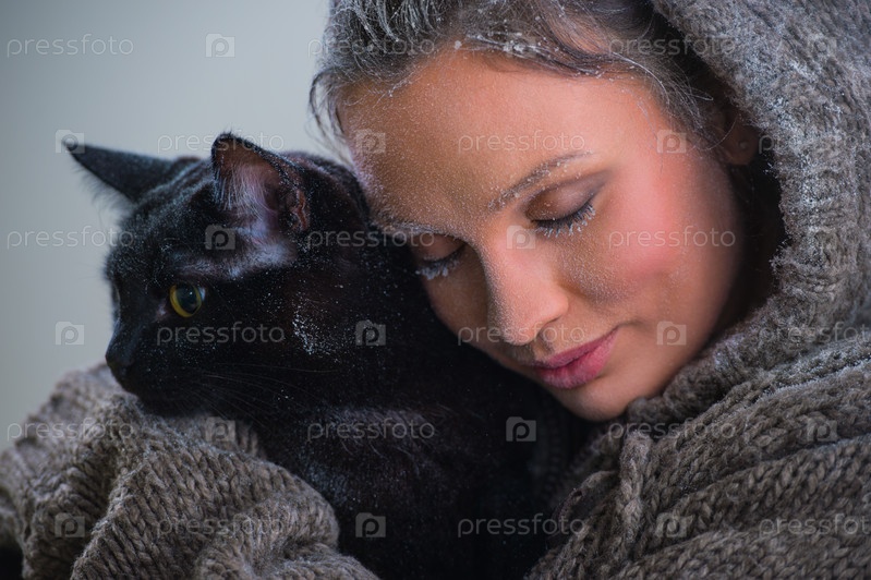 Зимний портрет доброй девушки с больним черным котом