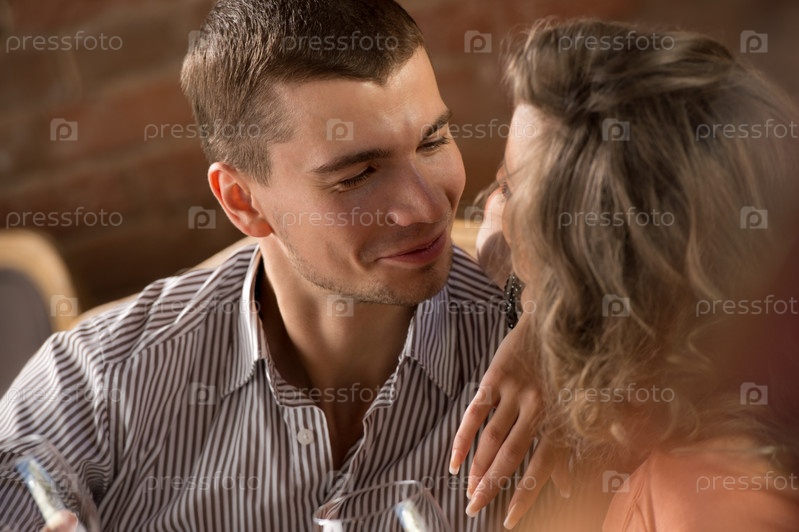 Молодая счастливая пара на романтическом свидании в ресторане