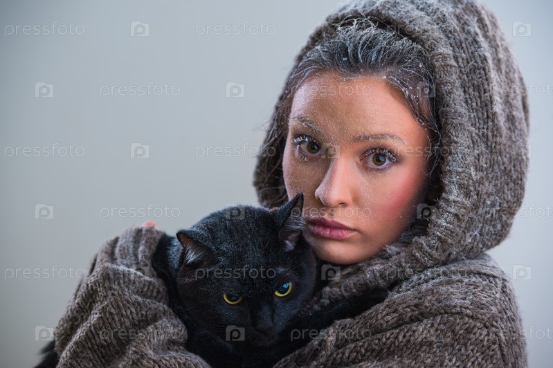 Зимний портрет доброй девушки с больним черным котом