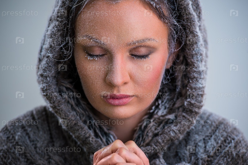 Женщина с инеем на лице и в капюшоне молится