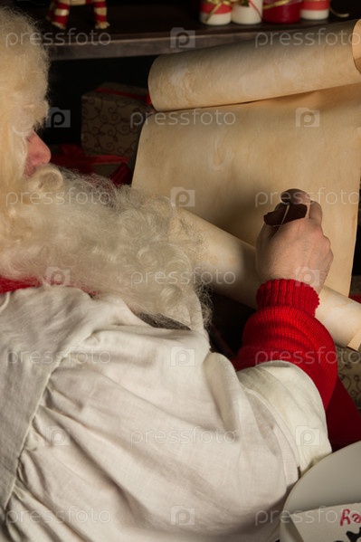 Санта-Клаус пишет пером на старом свитке, сидя дома