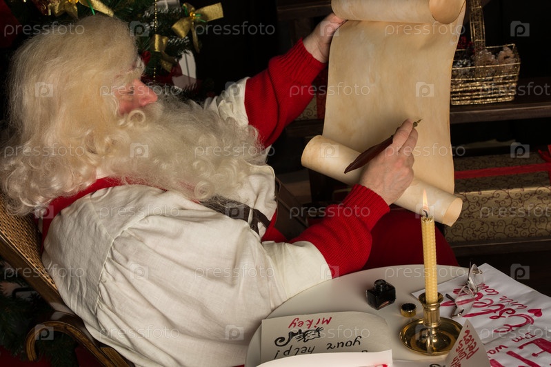 Санта-Клаус пишет пером на старом свитке, сидя дома