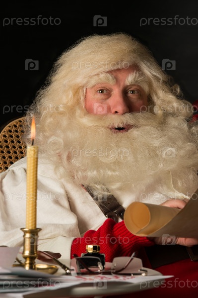 Санта-Клаус ситает список на старой бумаге, сидя дома