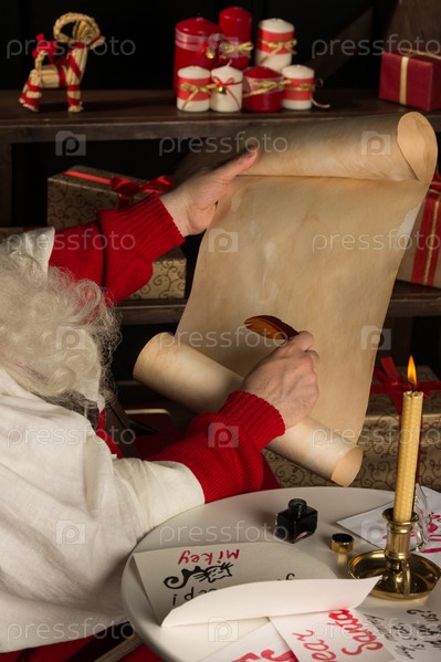Санта-Клаус пишет пером на старом свитке, сидя дома