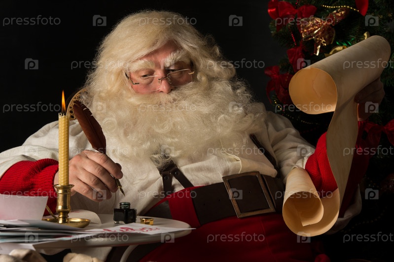 Санта-Клаус пишет пером на старом свитке, сидя дома