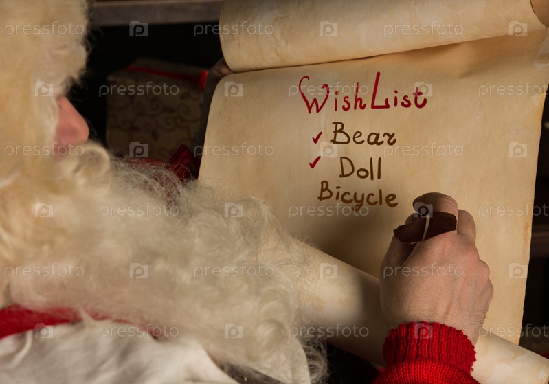 Санта-Клаус пишет пером на старом свитке, сидя дома
