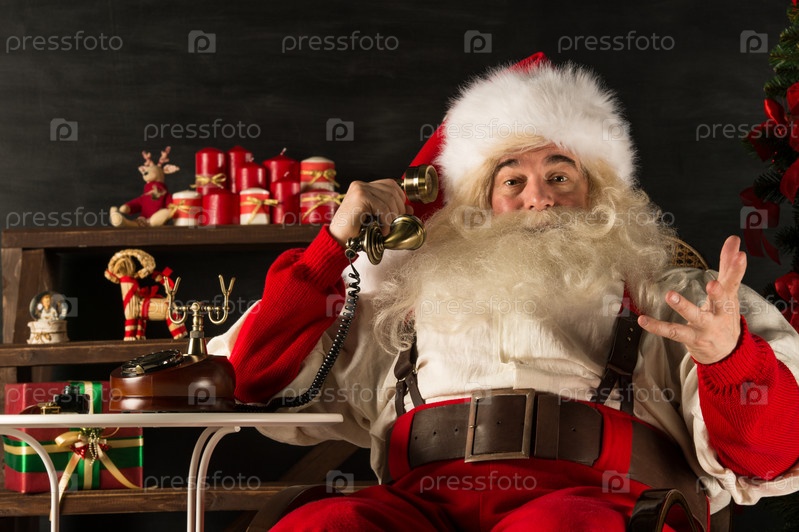 Портрет эмоционального Санта-Клауса, говорящео по телефону дома