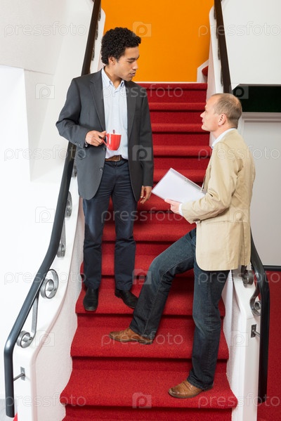 Бизнесмены обсуждают что-то на ступенях