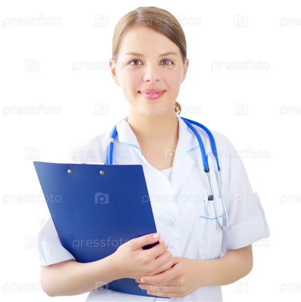 Женщина-врач держит блокнот, изолированная на белом фоне
