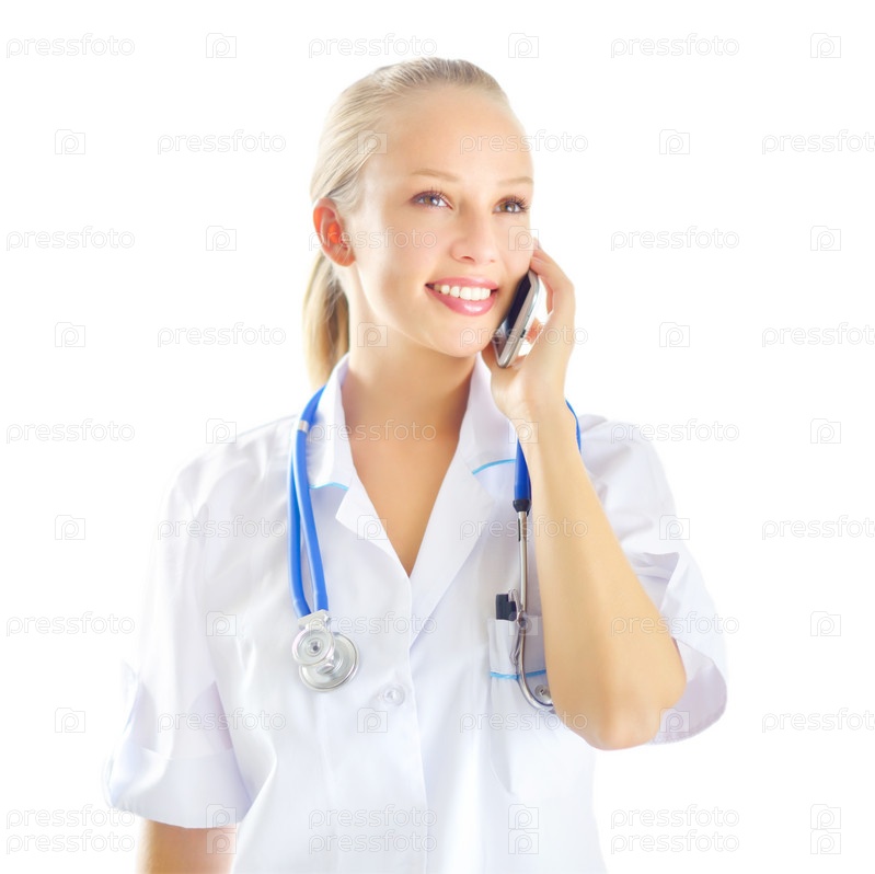Женщина-врач говорит по мобильному телефону, изолированная на белом фоне