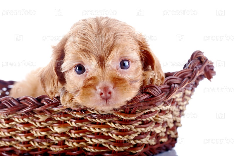 Щенок породы петербургская орхидея в корзине на белом фоне