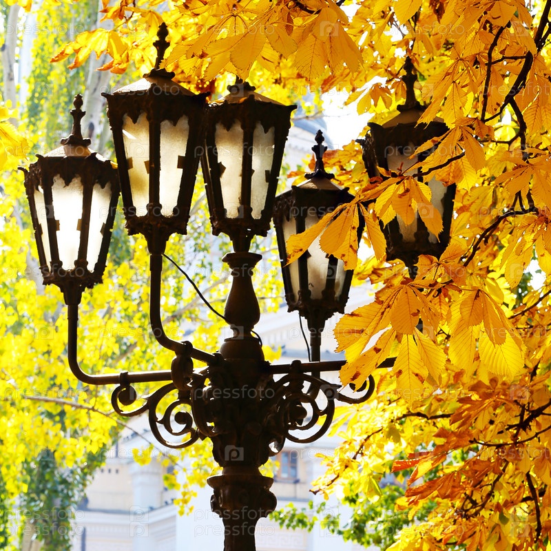 Уличный фонарь на фоне осенней листвы