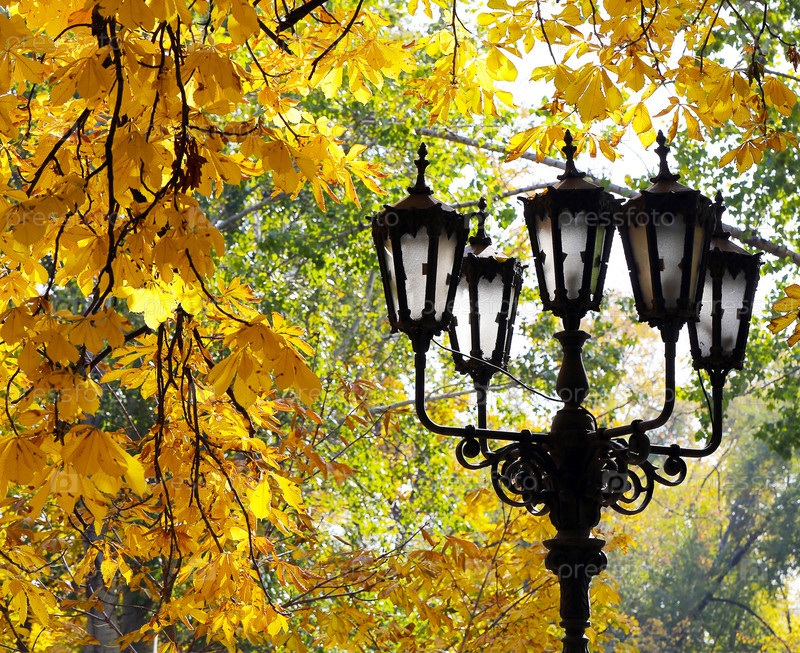 Уличный фонарь на фоне осенней листвы