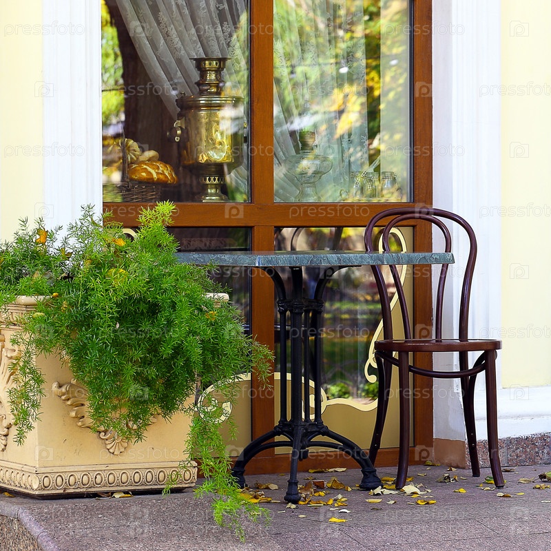 Одинокий стол и стул в осеннем кафе